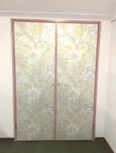 物置の扉に貼ったエレガントなアンティーク柄の壁用クロスで優しい空間を演出